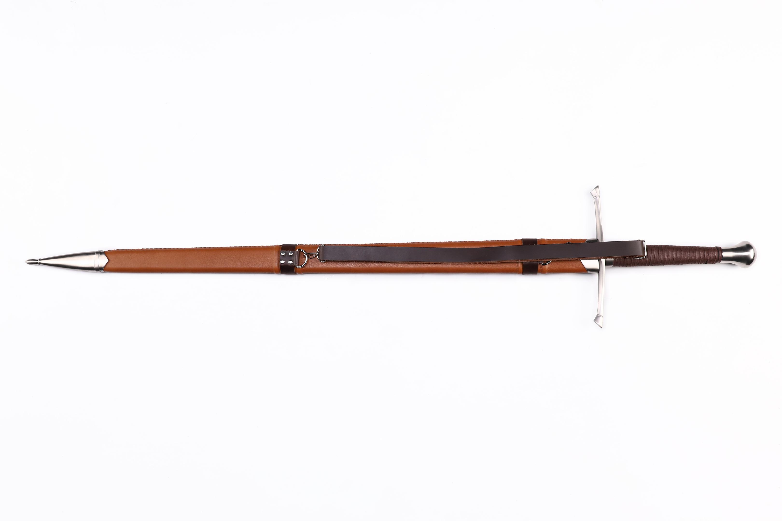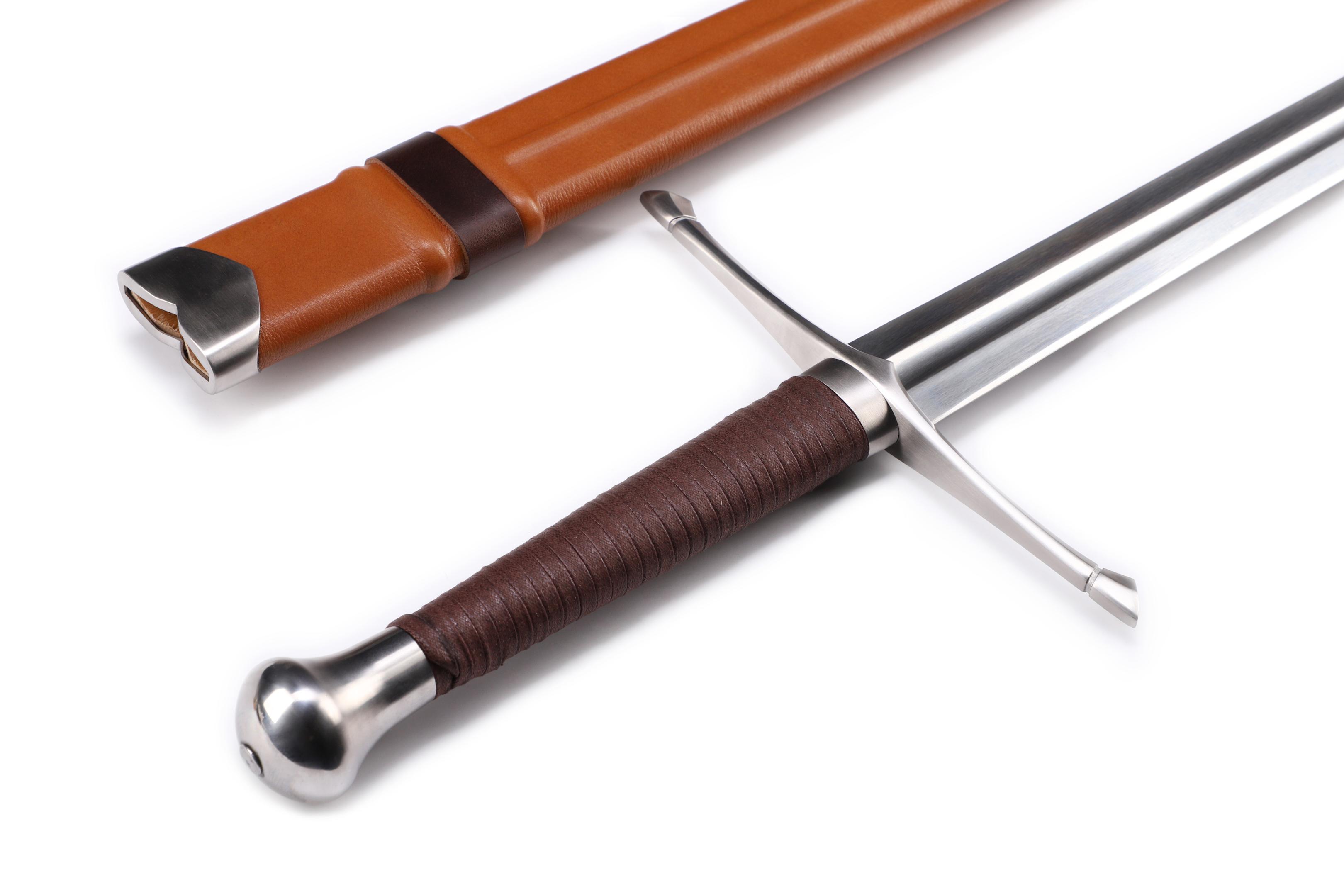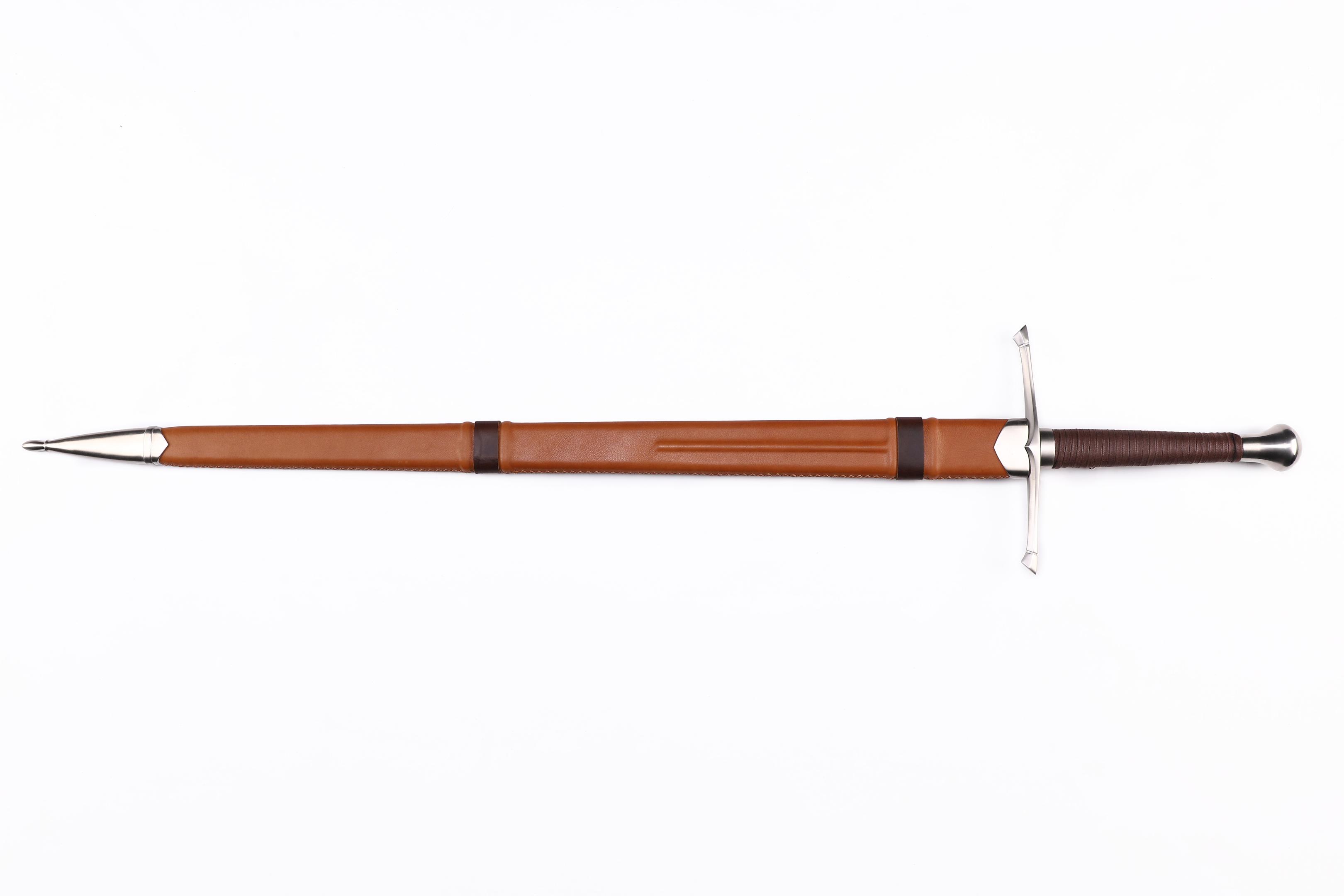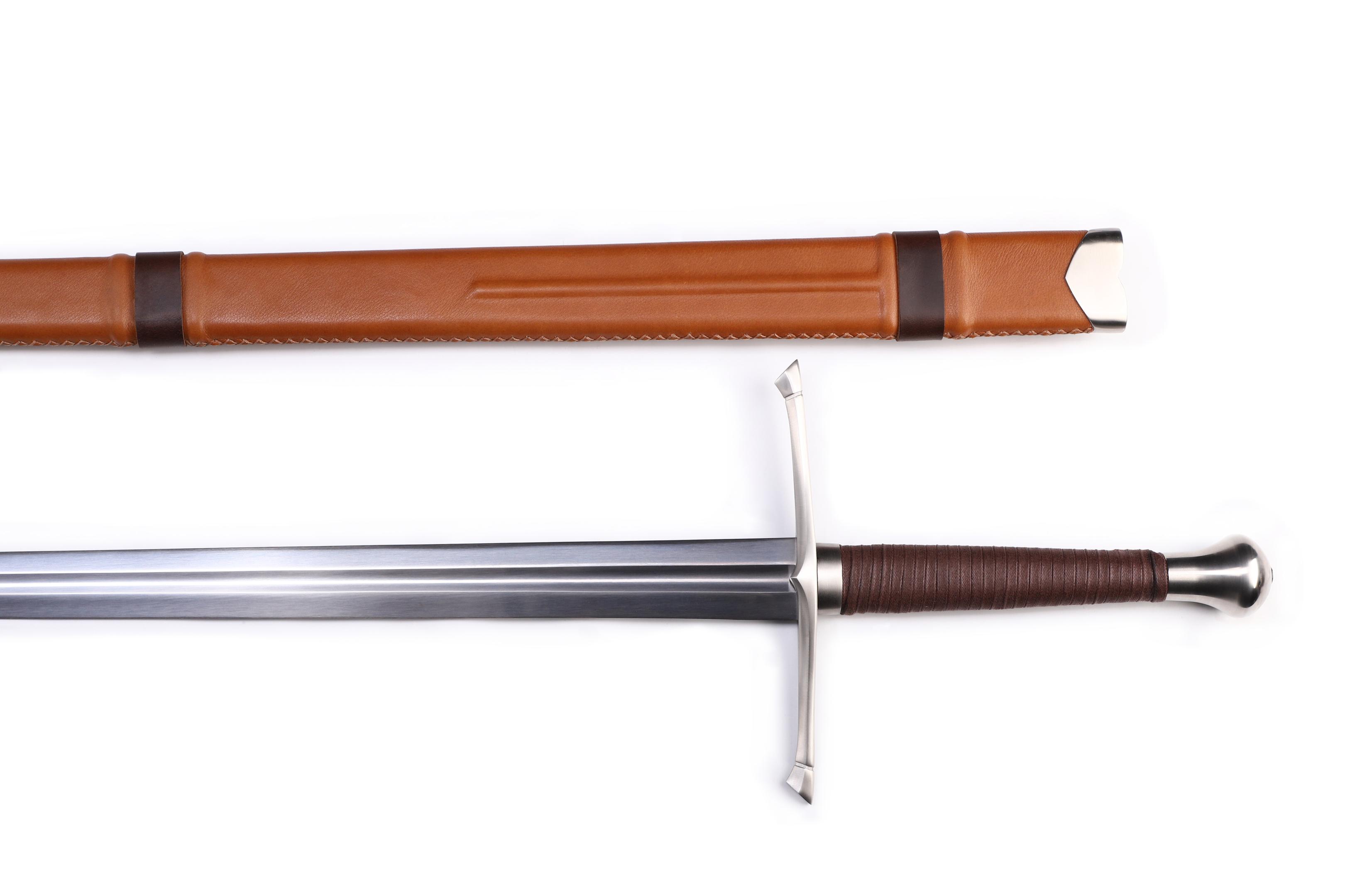 "Mogenlicht"- funktionelles Zweihand-Schwert mit Federstahlklinge und handgenähter Lederscheide basierend auf historischen Modellen.