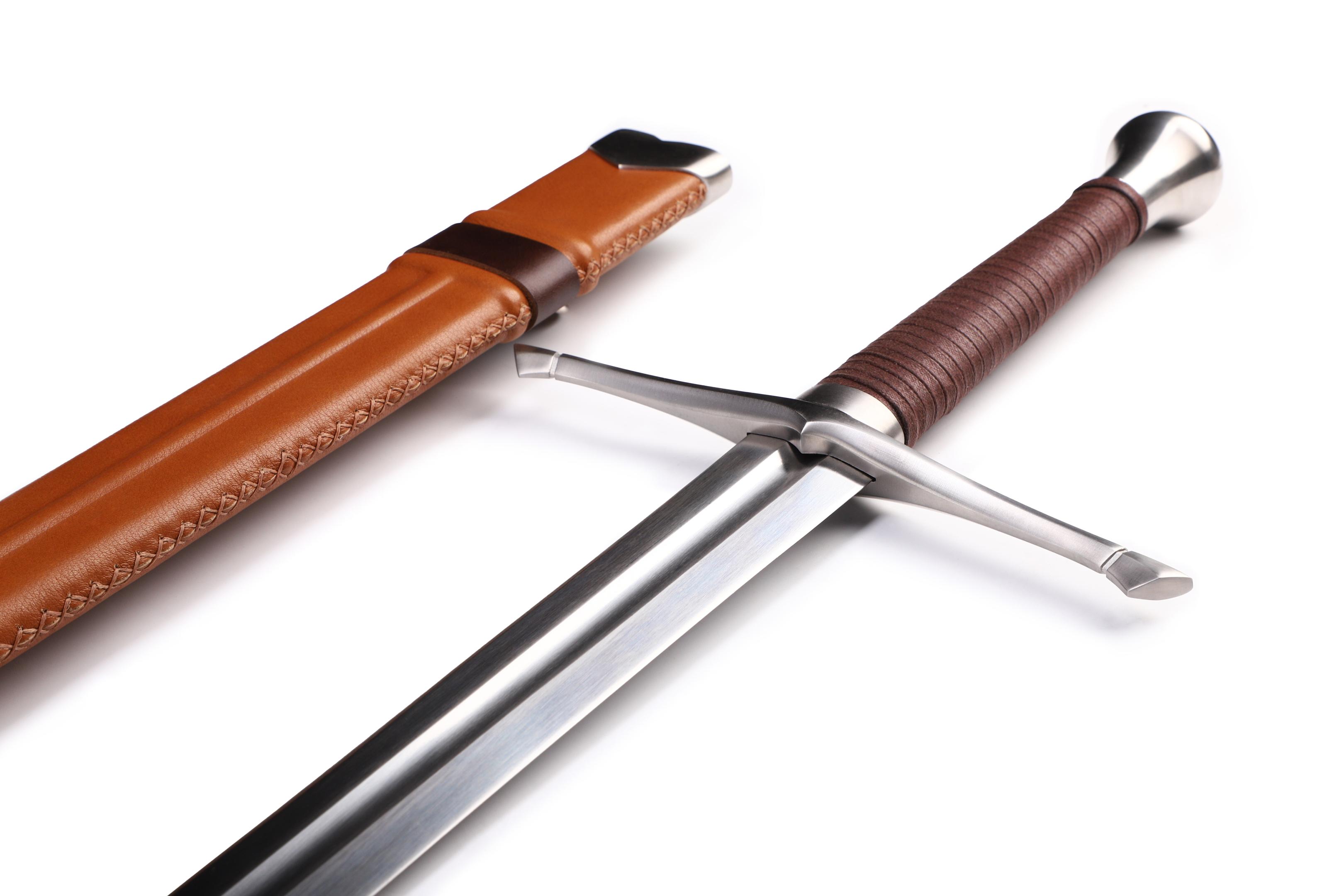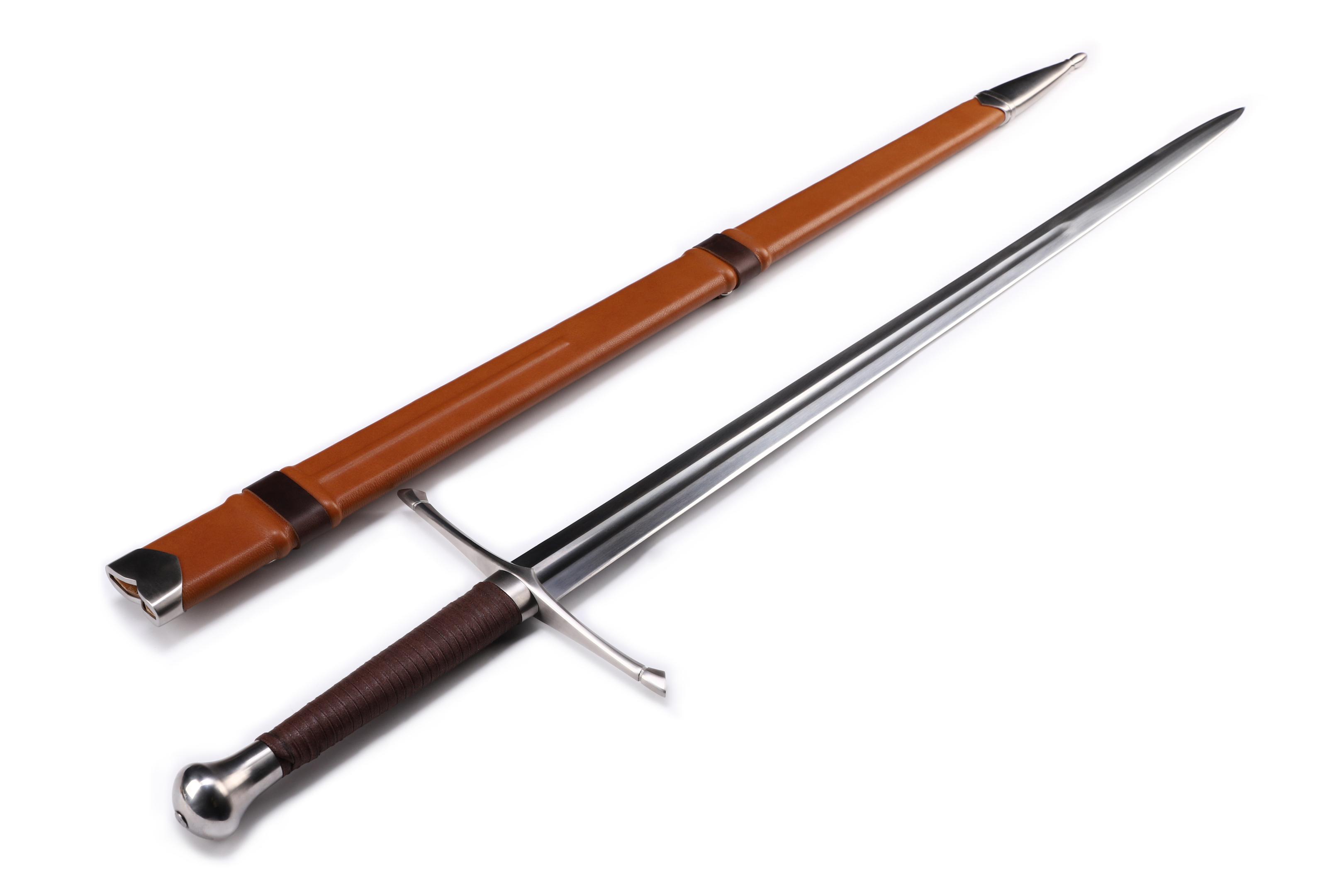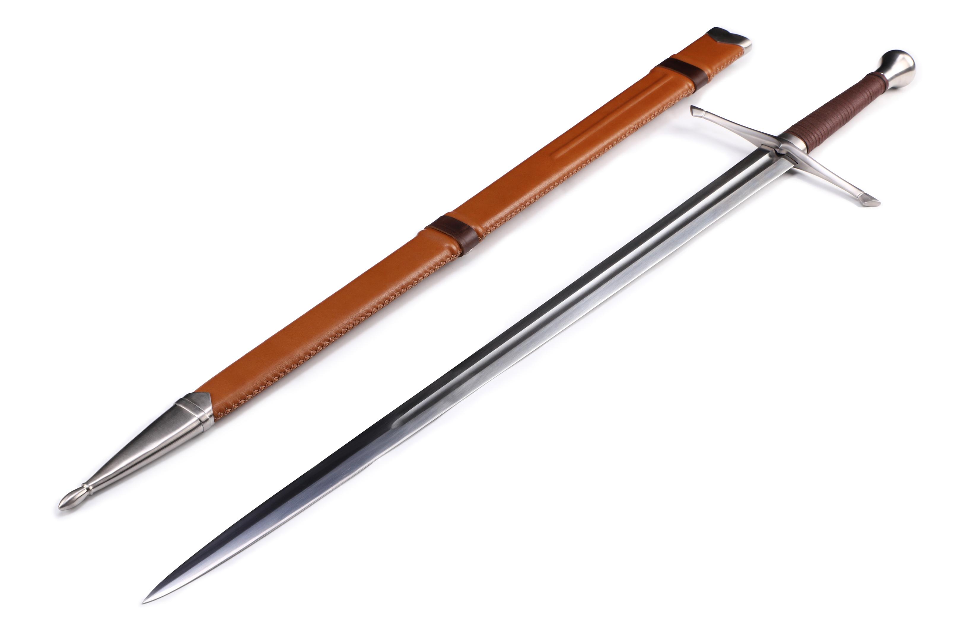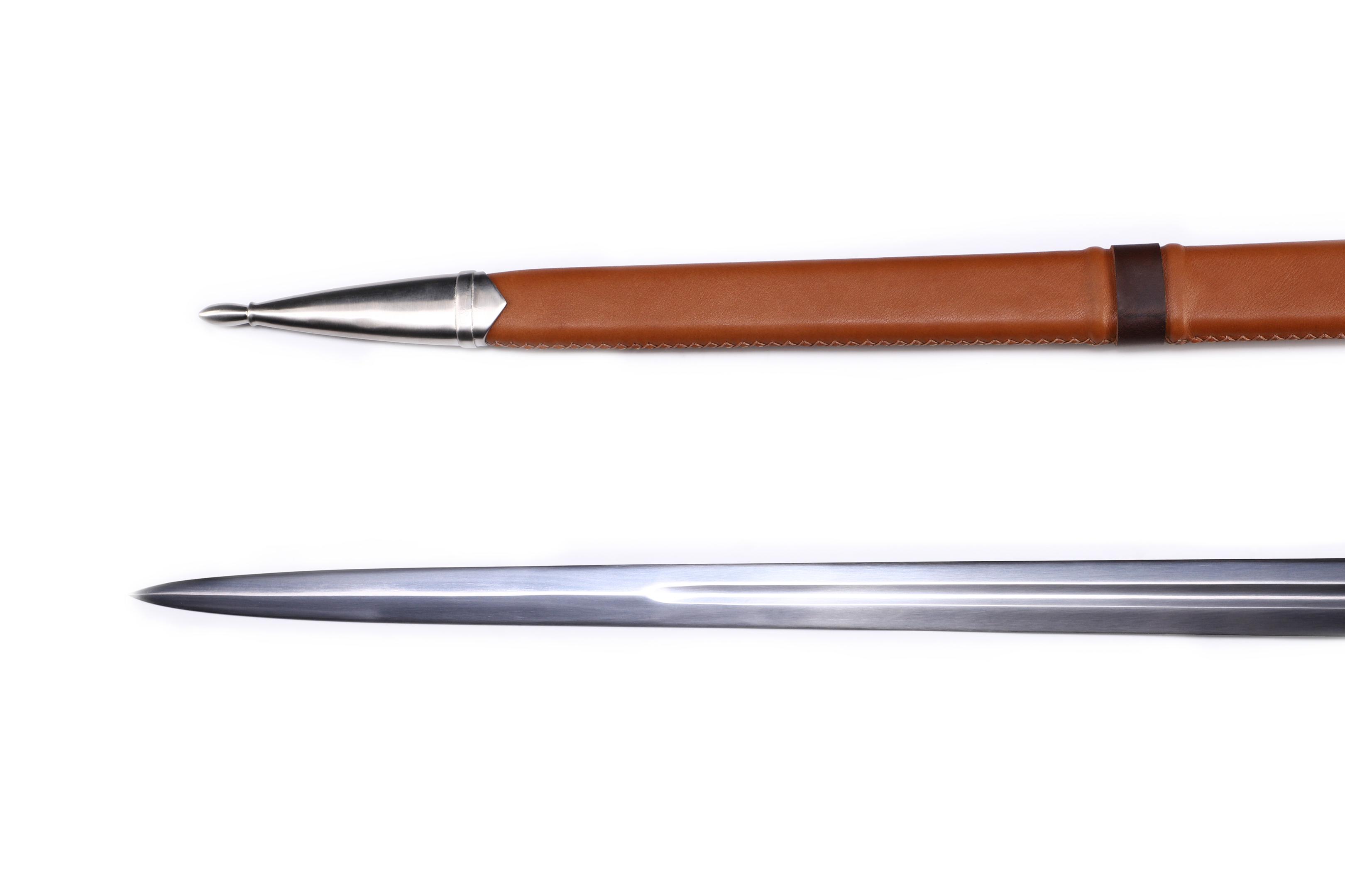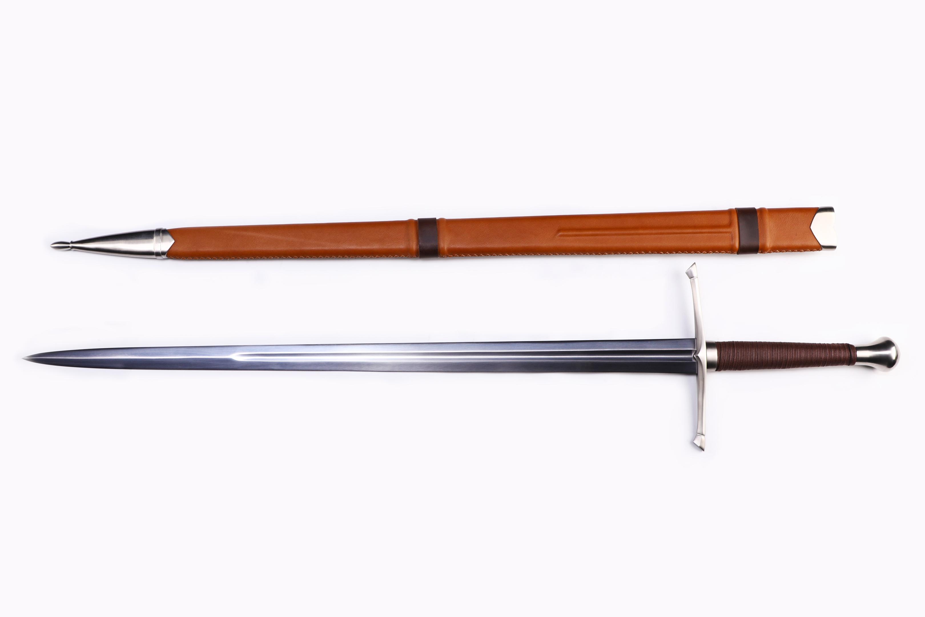 "Mogenlicht"- funktionelles Zweihand-Schwert mit Federstahlklinge und handgenähter Lederscheide basierend auf historischen Modellen.