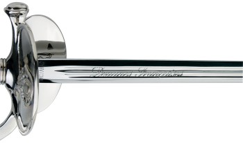 - Montur: Messing massiv, poliert von Hand, vernickelt, Stichblatt verziert mit Horn und Granate Wappen.