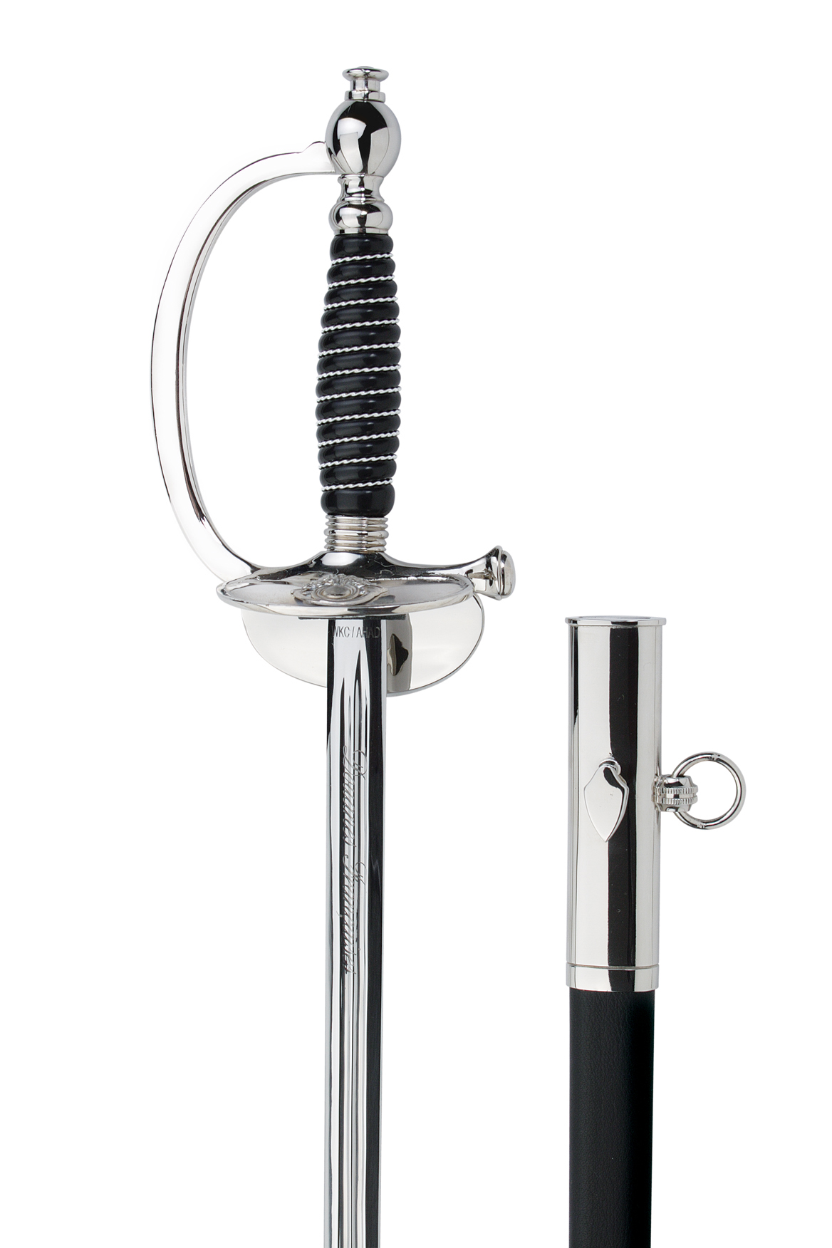 - Scheide: Beledertes Rohr, schwarzes Rinfleder, vernickelte Beschläge.