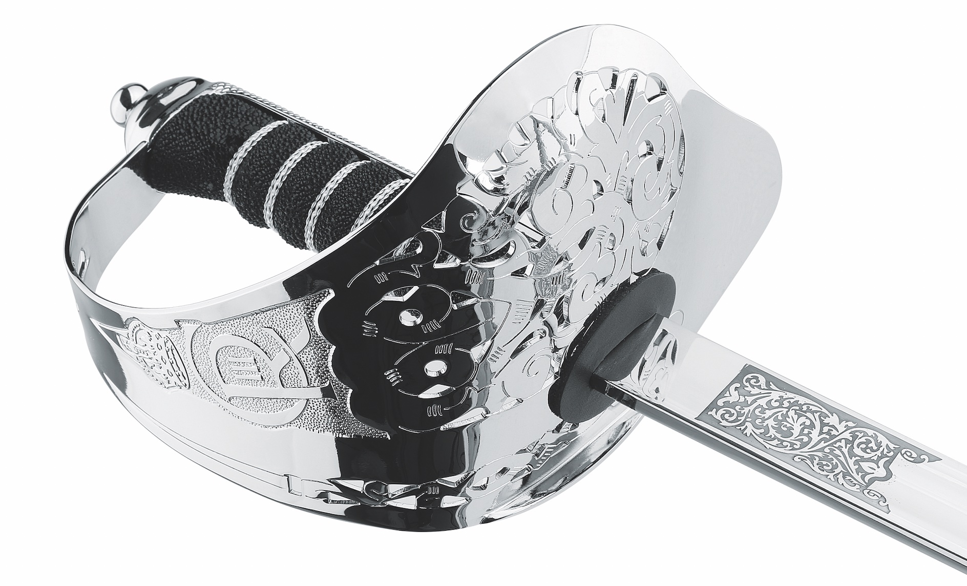 Der Griff des Schwertes ist massiv und mit Rochenhaut überzogenen, anschließend mit gedrehtem Messingdraht fest umwickelt. Es verfügt außerdem über eine grosses Gefäss, um die Hand des Benutzers zu schützen. Der Knauf, die Mutter und die Zwinge bestehen aus Messing, das Gefäss ist mit der Königschiffre geprägt, was für einen optischen Reiz sorgt.