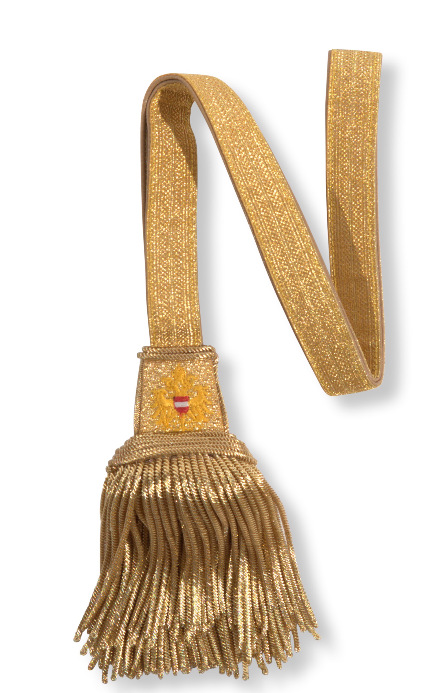The knot itself is gold-colored with fringes, the special feature of this sword knot is the double-headed eagle, which serves as an ornament. The eagle is a symbol of strength, power and freedom and is a major national symbol of Austria. Often used on coats of arms and flags, it has a long history in heraldry. The double-headed eagle is often depicted with spread wings and represents the historical importance of the country.