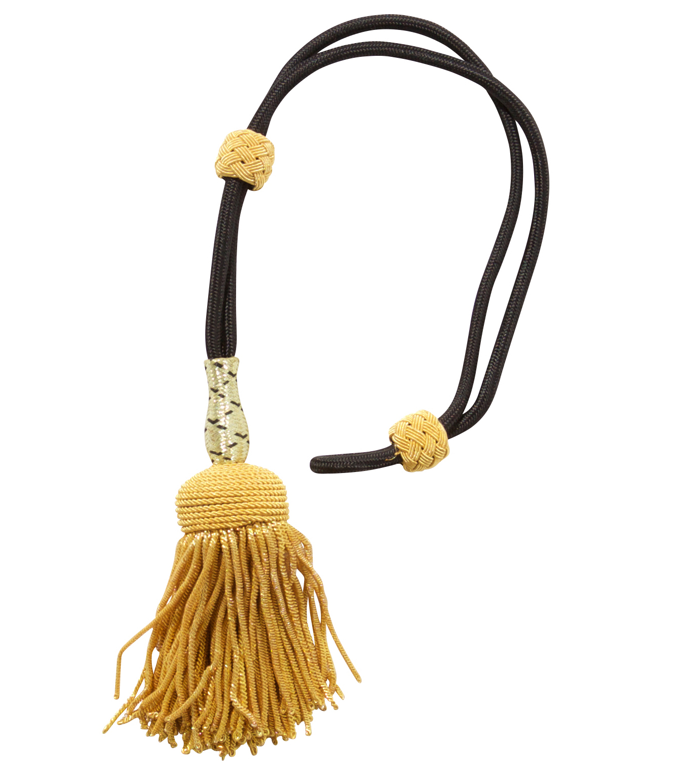 A beautiful sword knot is decorated with golden fringes and has an elegantly braided round black cord.
