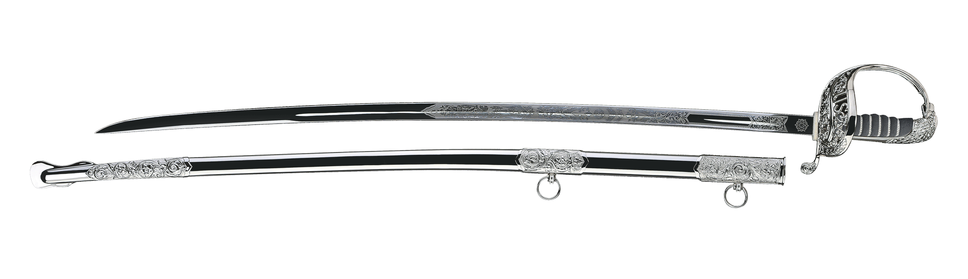 Le fourreau, ou gaine, est généralement en acier poli, avec 3 garnitures de fourreau ornementées et 2 anneaux de transport.