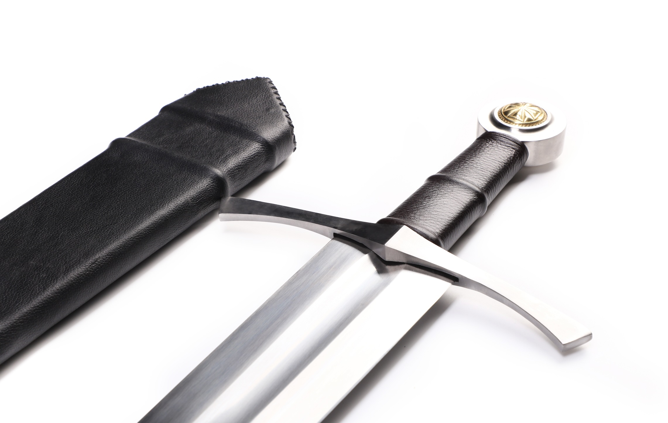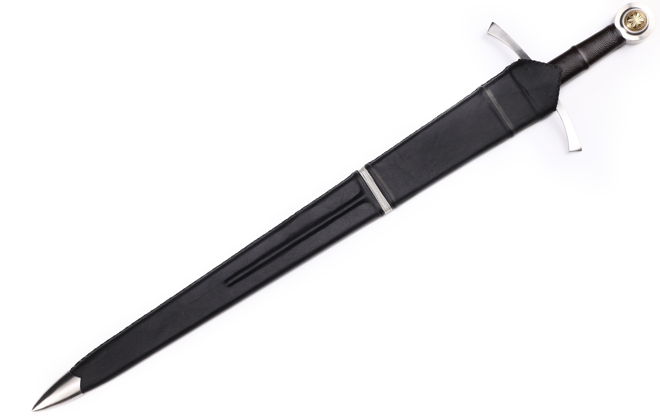 Cette épée de haute qualité combine une esthétique médiévale classique avec une fabrication solide et durable. La lame robuste en acier à ressort forgé assure une grande résistance et une excellente stabilité. La lame est pleine soie et solidement vissée dans le pommeau.